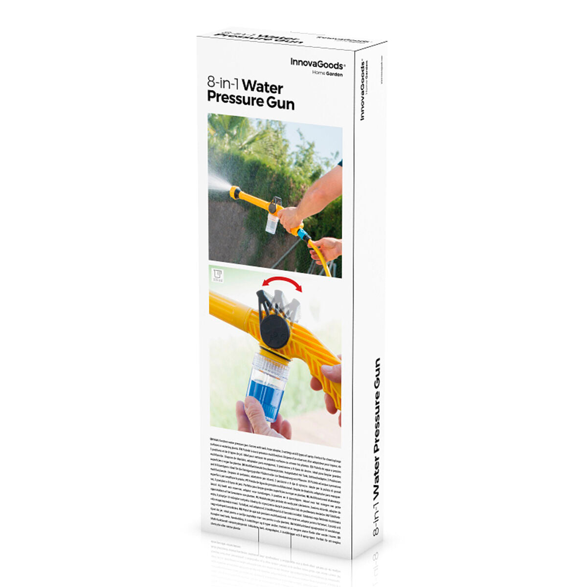 Den er perfekt til at rense vægge, gulv, biler, vinduer, osv. takket været trykket fra vandet og beholderen med til integreret sæbe. Derudover er den også perfekt til at vande blomster eller græs, da man kan fylde beholderen op med insektmidler eller gødning. Den er meget nem at bruge, den sættes nemt og hurtigt fast på enhver form for vandslange og man kan kontrollere vandets tryk.